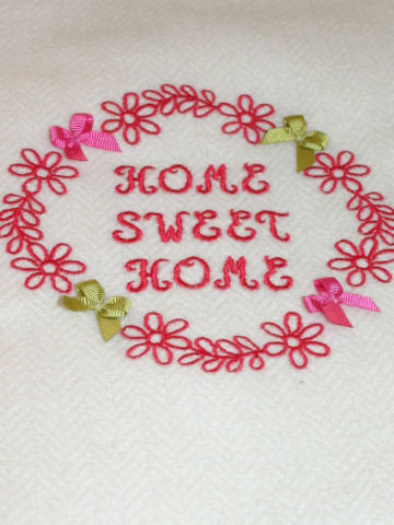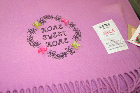 Home Sweet Home throw from Avoca. All Avoca throws are made to make a house a home. Here in lilac and cream and embellished with the wording "Home Sweet Home" and pretty bows.